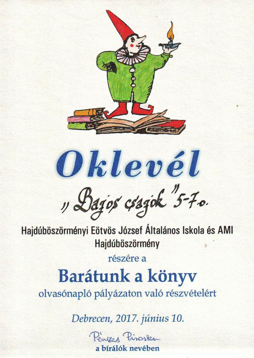 Iskolánk csapata 303,5 ponttal bekerült a "Barátunk a könyv" megyei pályázat díjazottjai közé. (A legmagtasabb pontszám 305 volt.) A nyertes csapat tagjai: Csapó Fanni, Molnár Anna 5.b. és Horváth Boglárka, Nagy Csilla 7.a.